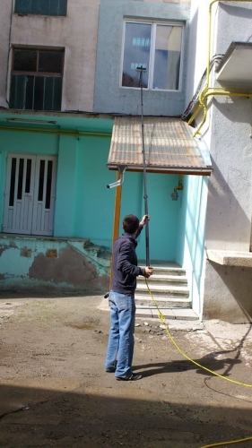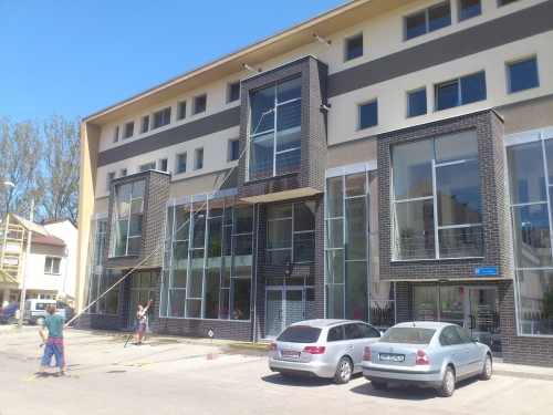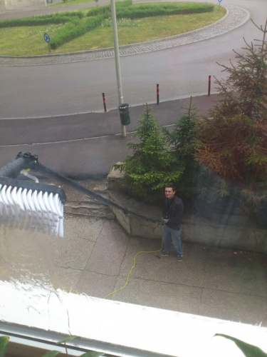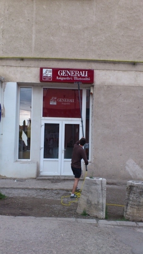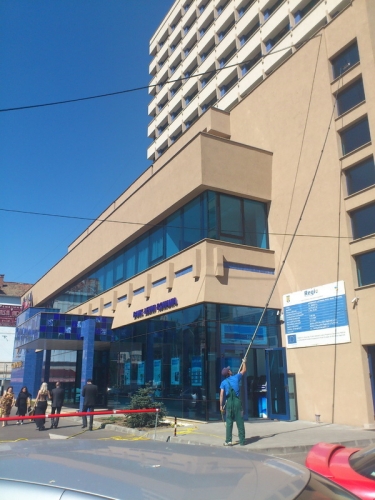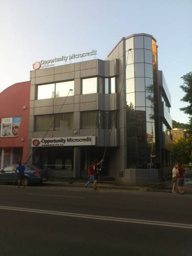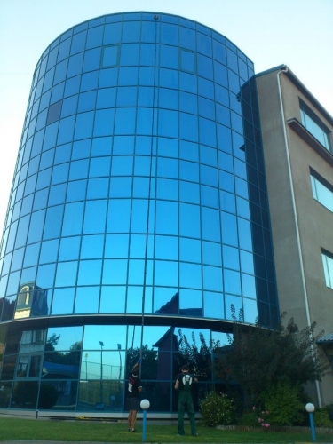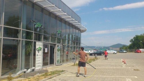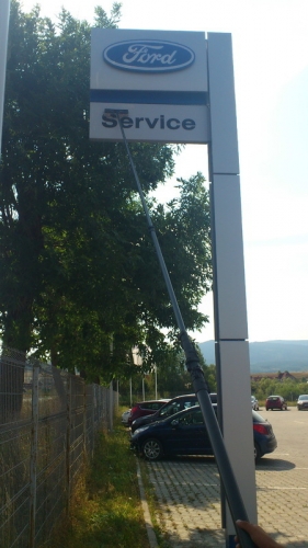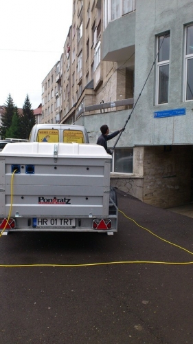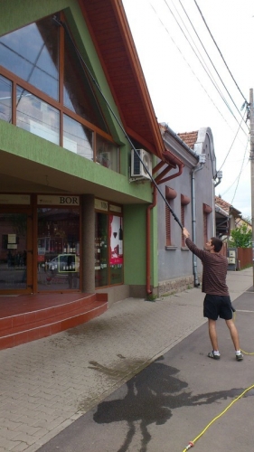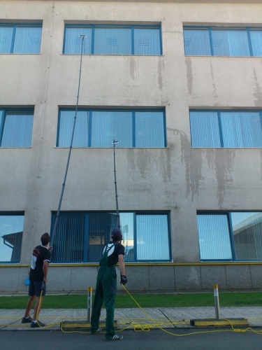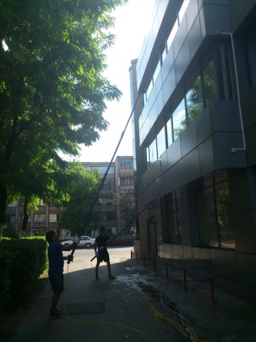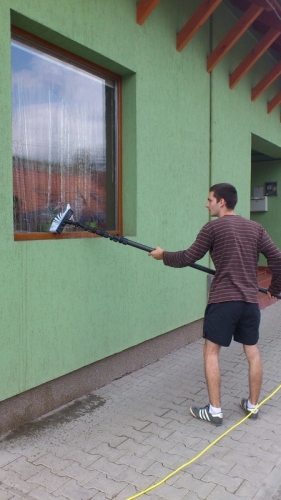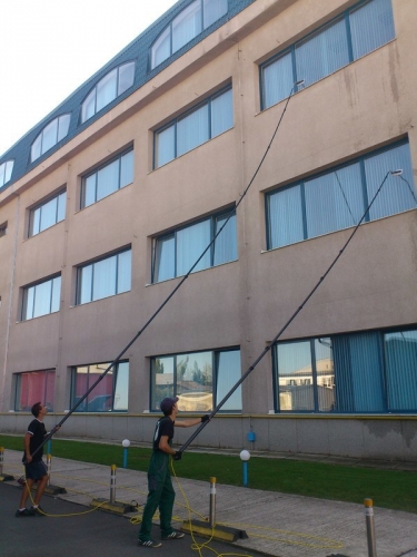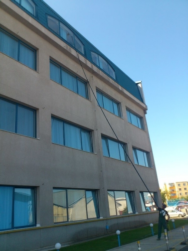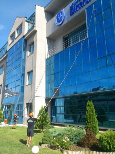 Sistemul Water Fed Pole este un sistem de filtrare cu 4 trepte - mecanic, filtru cărbune, osmoza inversă şi de-ionizare - se obţine o apă de o puritate aproape 100%. Cu ajutorul cozilor telescopice din materiale compozite - fibră de sticlă sau fibră de carbon - şi perii foarte uşoare, se curăţă cu apă şi frecare geamurile şi faţadele de până la 18 metri înălţime înlocuind alpinismul utilitar cu un cost redus pentru client.